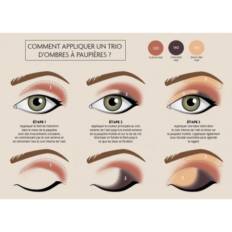 L’ombre à paupières cuivre au fini irisé apporte immédiatement une touche de lumière et d’éclat au regard. Elle s’applique en teinte unique ou plus communément sous l’arcade sourcilière en combinaison avec la teinte taupe et/ou doré clair irisé pour sublimer et agrandir le regard.