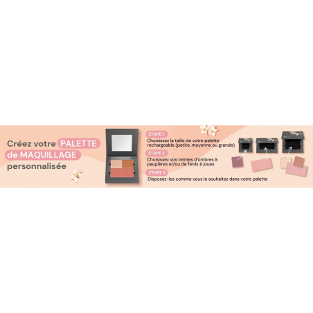Choisissez la taille de votre palette rechargeable (grande pour 2 fards à jours ou 1 fard à joues et 2 ombres à paupières), moyenne pour 1 fard à joues.
