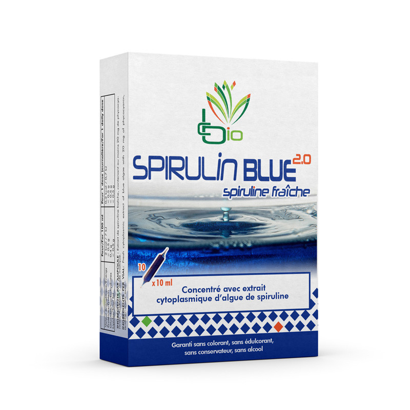 100 % naturel, SPIRUL IN BLUE 2.0 est un extrait pur de spiruline fraîche, sans addition de produits chimiques. Sa couleur bleue entièrement naturelle est preuve de sa richesse en phycocyanine (teneur minimum de 20 mg par ampoule de 10 ml garantie).