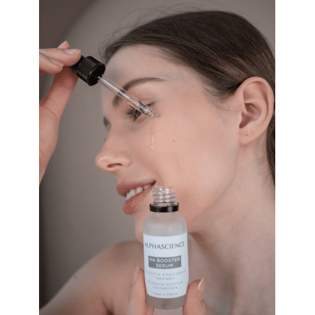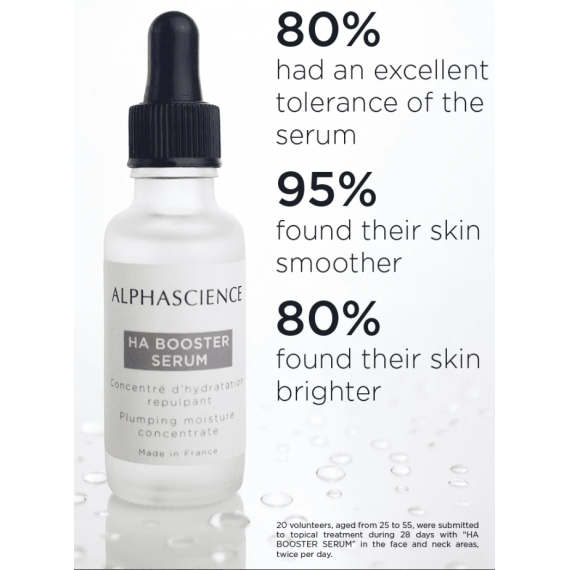 Le sérum HA BOOSTER contient 3 sortes d'acide Hyaluronique (Hyaluronic Acid d'où le nom HA BOOSTER) : Haut et bas poids moléculaire et complexé au silicium organique pour une pénétration optimale de l'acide hyaluronique.